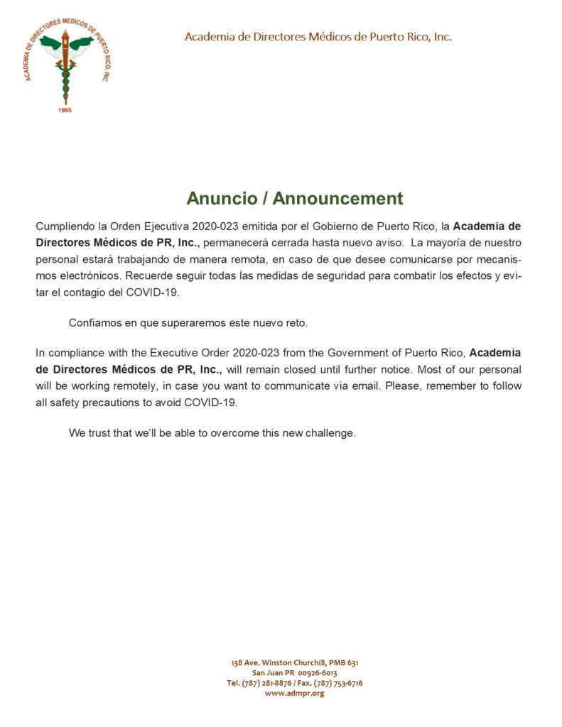 ACADEMIA DE DIRECTORES MEDICOS DE PR, INFORMA: Teléfonos/”e-mails” : Dra. Nélida Rivera, Directora Ejecutiva – 787-613-7654 nrivera@admpr.org Sra. Celina Marín, Asistente Administrativa – 939-777-8840 admin.assist@admpr.org 23/Mar/2020, por Celina R. Marín